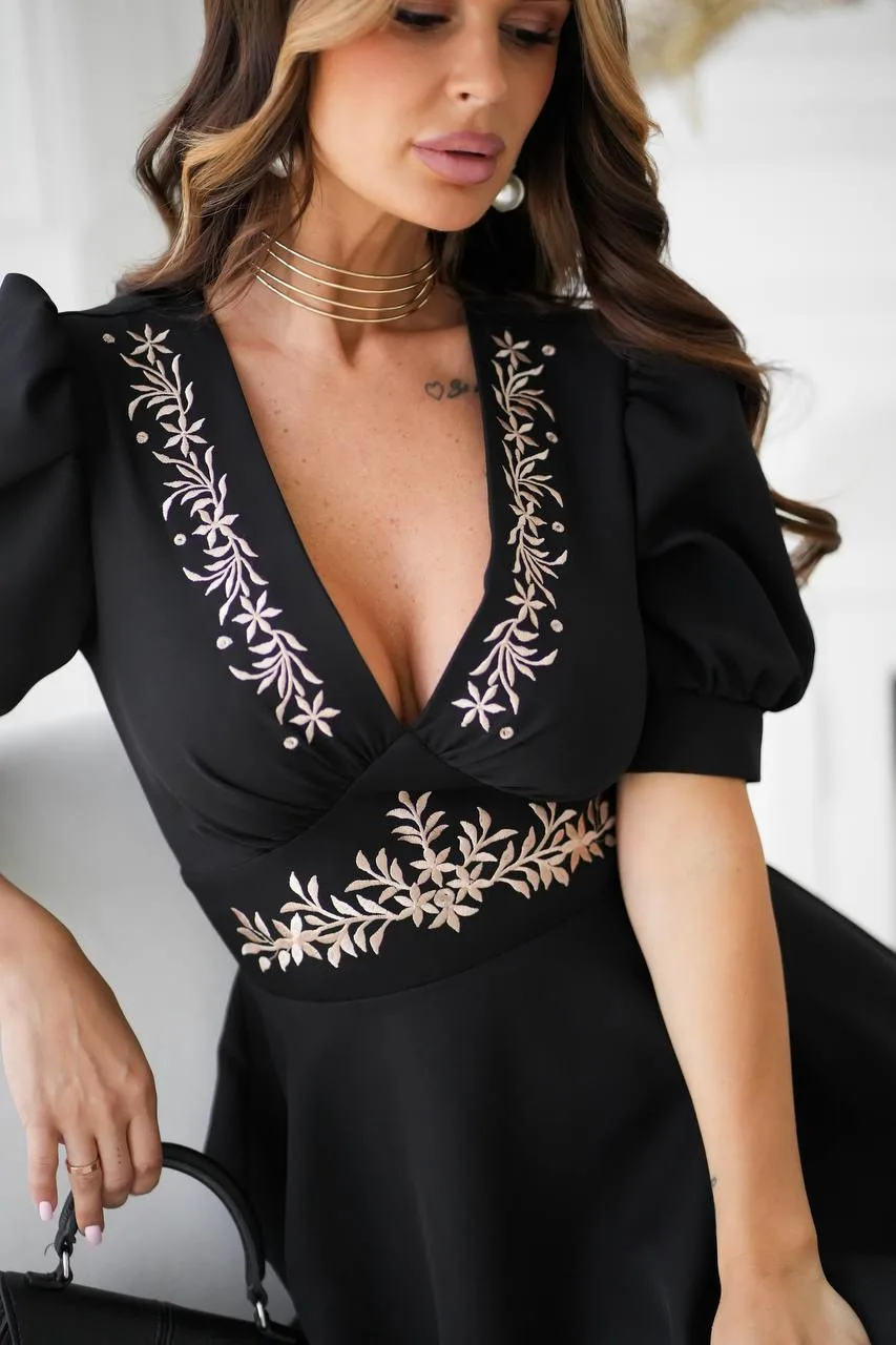 Елегантна сукня з V-вирізом, прикрашена вишивкою в області декольте та талії. Завдяки об’ємним рукавам і розкльошеній спідниці модель красиво підкреслює силует і додає образу ніжності та вишуканості.